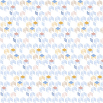 Imprimé composé de motifs géométriques. Des hexagones bleu ciel comme des trames de fond, quelques uns orange apportent un rythme. Des losanges de couleurs plus marquées, bleus, orange ajoutent un pétillement dans un ensemble plutôt doux.